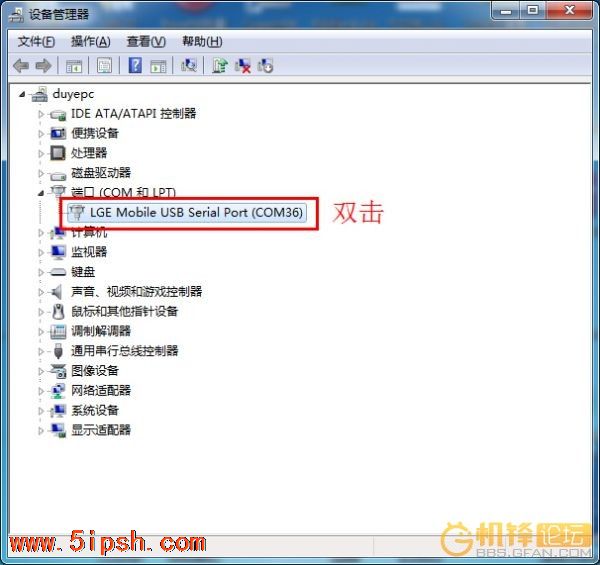 第五步:进入刷机模式后,查看电脑设备管理器(计算机右键 – 管理 – 设备管理器)中是否已经显示 LG 开头的 COM 端口,显示后如下: