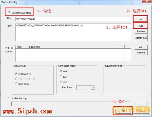 第四步:将手机进入双箭头刷机模式,G3 的进入方法是:关机后按住音量上键插数据线,手机显示 download mode 后松手,稍等几秒后即可进入双箭头刷机模式
