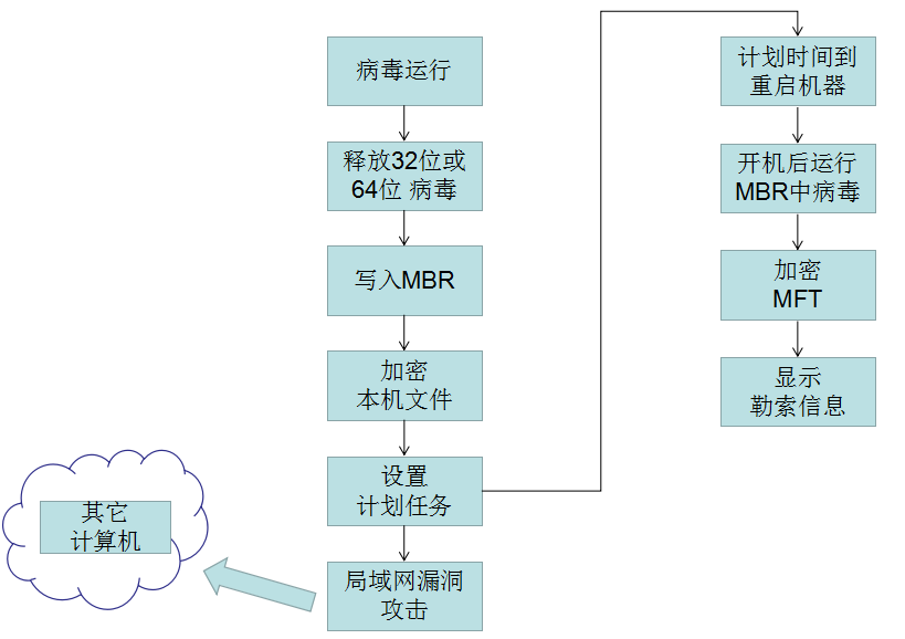 病毒采用多种感染方式,主要通过邮件投毒的方式进行定向攻击,利用 EternalBlue(永恒之蓝)和 EternalRomance(永恒浪漫)漏洞在内网横向渗透。