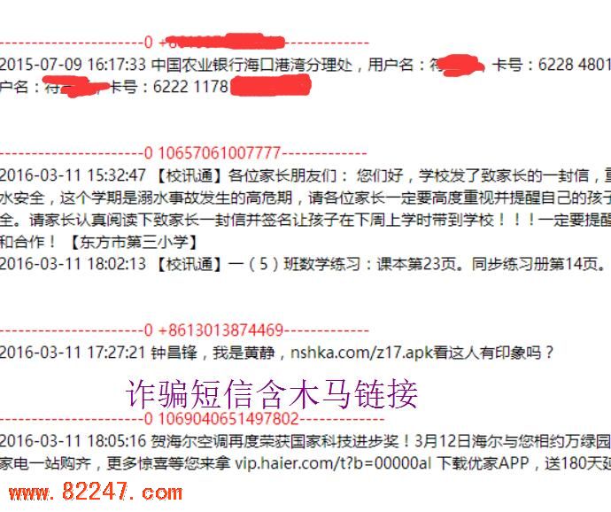 该团伙通过发送诱惑短信,例如: 黄 *,我是 **,nshka.com/z17.apk 看这人有印象吗?,此处 ** 均为受害人真实姓名,诈骗团伙通过该木马获取受害人手机短信记录和通讯录,分析受害人的信息,定向的发送短信诱骗受害人通讯录好友点击链接下载木马。安装木马后将下一位受害人的通讯录短信等又备份以此类推,类似蝴蝶效应,获取信息量十分可怕,到本站发文前, 该木马已经获取数百人通讯录,上千条真实的手机号码信息 。通过熟人模式诱骗受害人转账等,造成财产等损失。