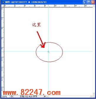 五、画出印章的边缘。选择椭圆工具,把鼠标放在横竖标尺的中心点上,按住 shift+alt 键,拖动鼠标得出一个证圆。下图