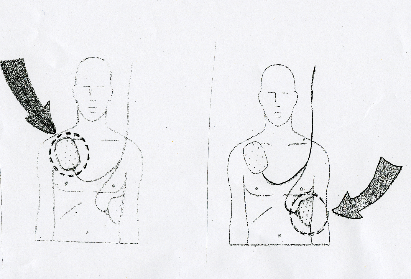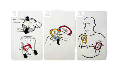2、给患者贴电极,在患者胸部适当的位置上,紧密地贴上电极。通常而言,两块电极板分别贴在右胸上部和左胸左乳头外侧,具体位置可以参考 AED 机壳上的图样和电极板上的图片说明。也有使用一体化电极板的 AED,如将在本次北京奥运会会场配置的 ZOLL AED Plus。