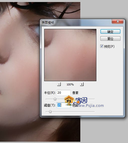 8. 激活背景副本,滤镜》模糊》表面模糊,参数如下,将其不透明度改为 65%。