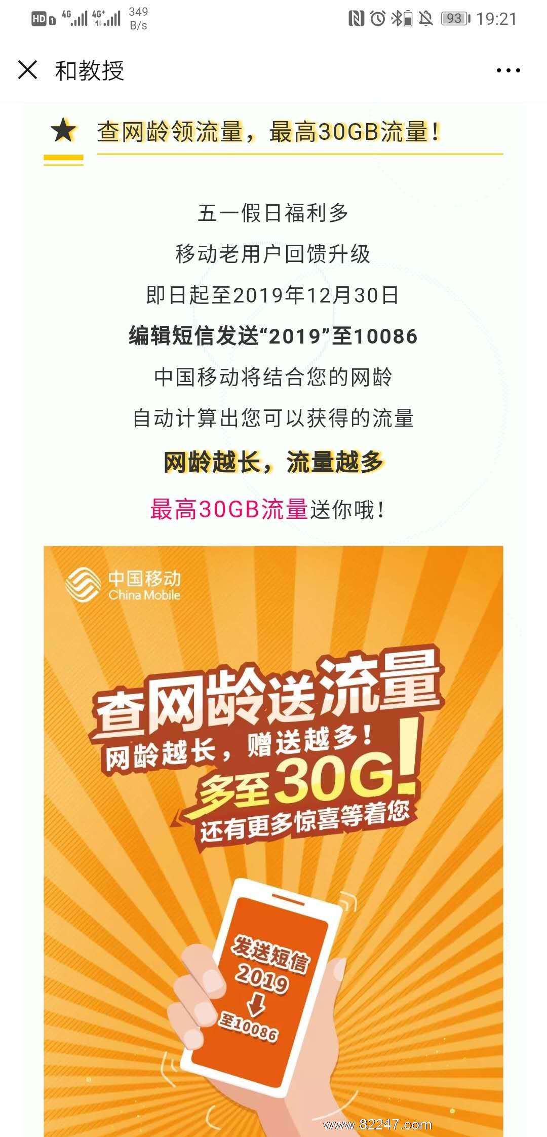 移动用户向 10086 发送“2019”可以参加查“网龄”送流量活动。