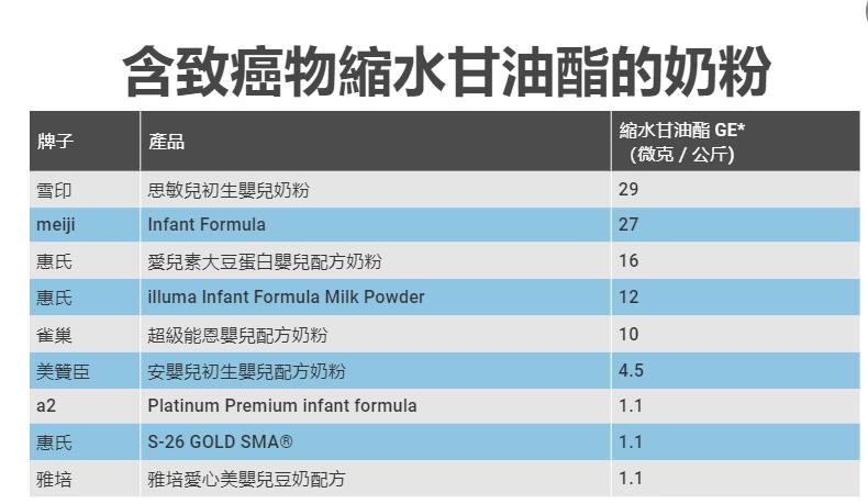 香港消委会 8 月 17 日指,近年发现基因致癌物环氧丙醇(gylcidol)以缩水甘油酯(gylcidyl esters, GE)的形态,存在于棕榈油和婴儿配方奶粉等食材上,均为植物油脂在高温精炼时产生。消委会续指,环氧丙醇具有基因毒性及致癌性,一般建议尽量减低从食物内摄取。